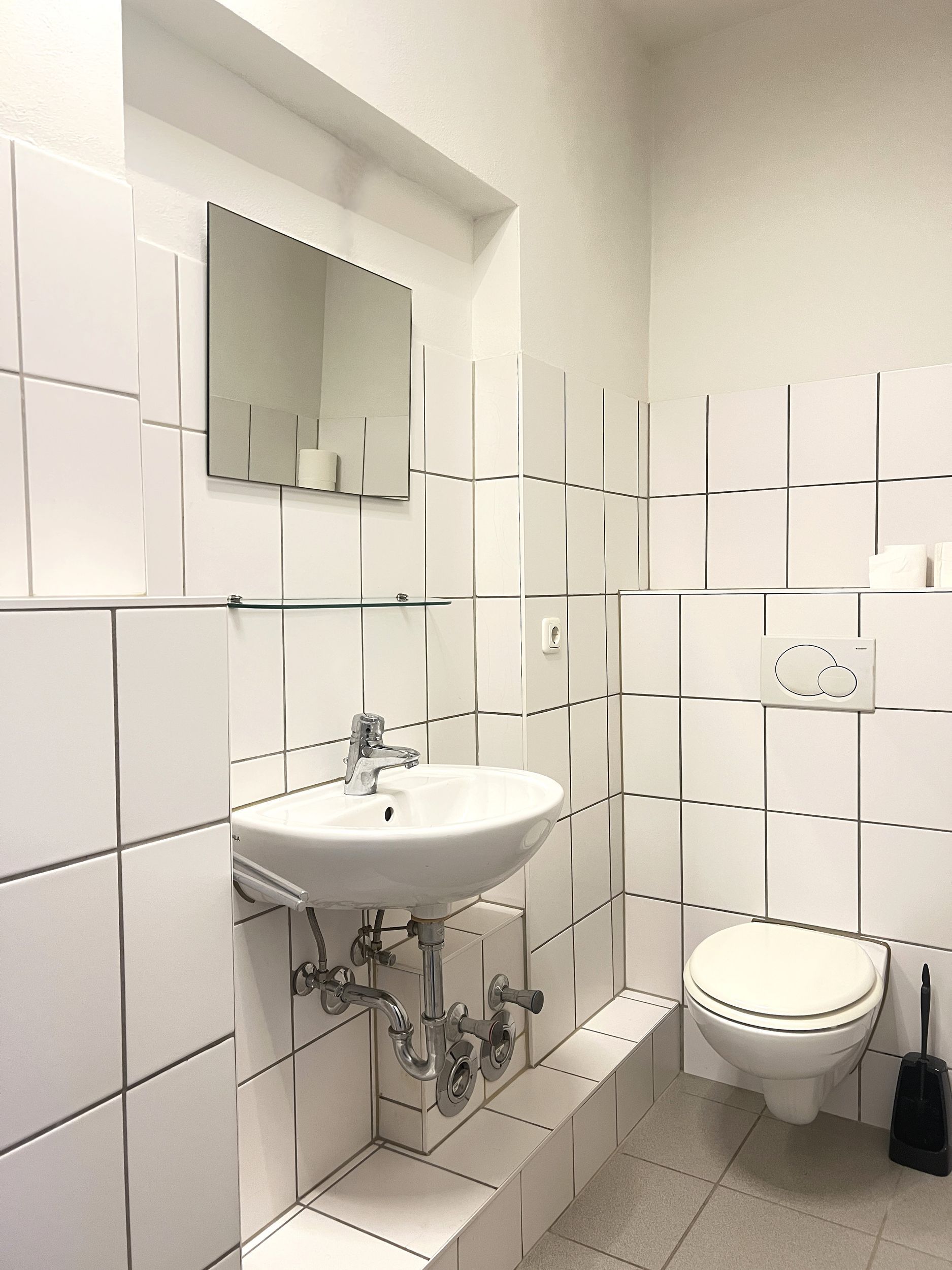 Das Badezimmer ist mit zeitlosen weißen Fliesen ausgestattet. Es verfügt über eine Dusche, ein WC und ein Waschbecken und bietet somit alles, was für den täglichen Komfort erforderlich ist.