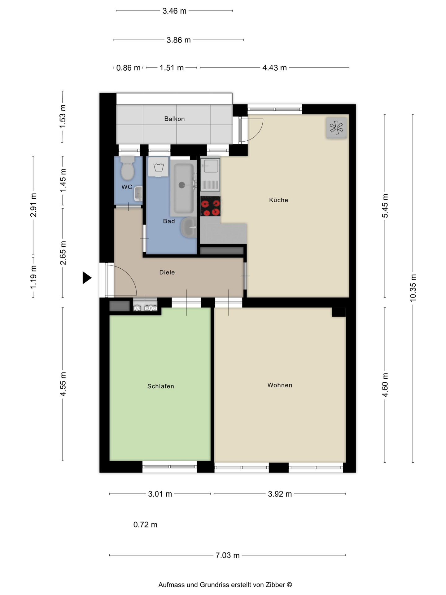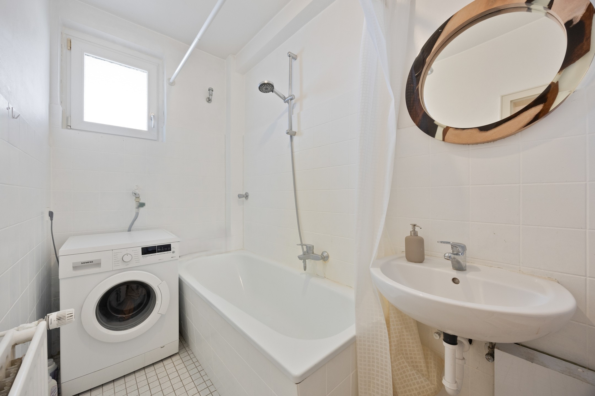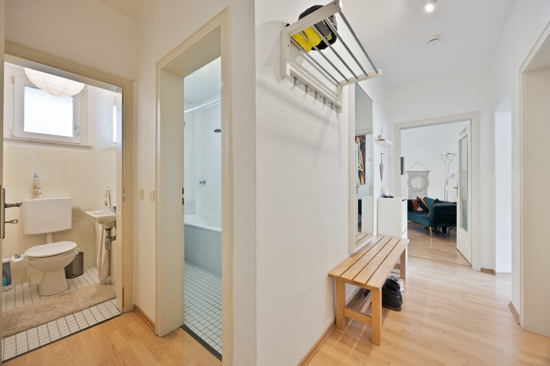 Das Tageslichtbad ist mit einer Badewanne, einem Waschbecken sowie einem Waschmaschinenanschluss ausgestattet. Ergänzt wird der Sanitärbereich durch ein separates WC, was den Wohnkomfort zusätzlich erhöht.