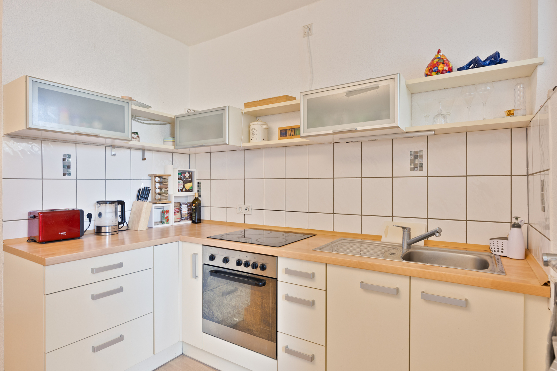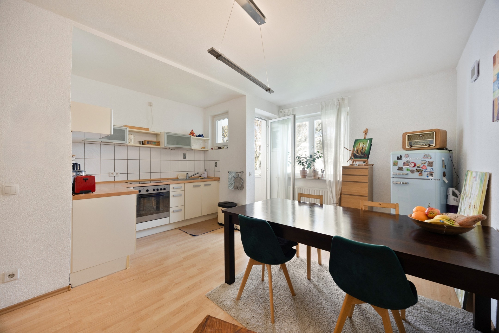 Die separate Küche ist funktional gestaltet und bietet neben einer Einbauküche ausreichend Platz für einen großzügigen Essbereich. Insbesondere bei einer Nutzung als Wohngemeinschaft entsteht hier ein zentraler Treffpunkt, während die übrigen Räume flexibel als Schlafräume genutzt werden können, ein Konzept, das in nachfragestarken Lagen eine überdurchschnittliche Vermietbarkeit ermöglicht.