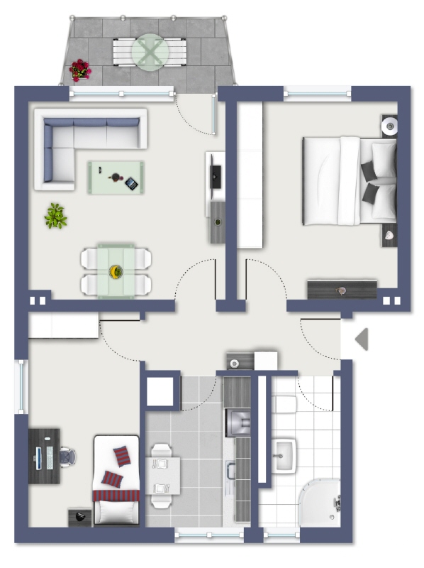 Auf der linken Seite befinden sich das Tageslichtbad mit Dusche und die Küche. Zu Ihrer Rechten das Schlafzimmer gefolgt vom Wohnzimmer. Das Büro/Gästezimmer befindet sich vor Kopf.