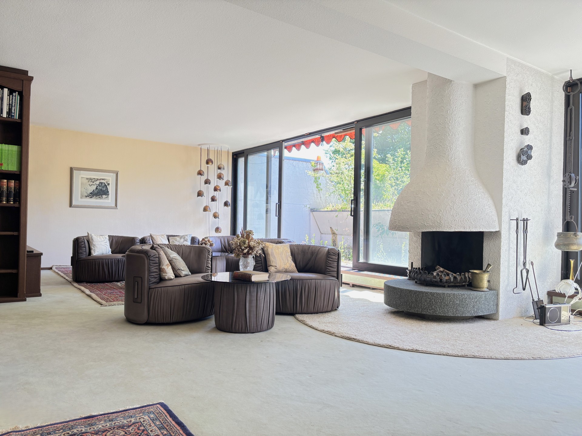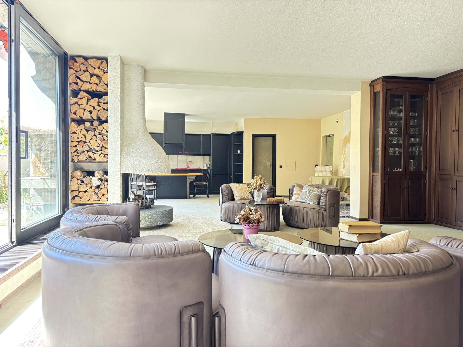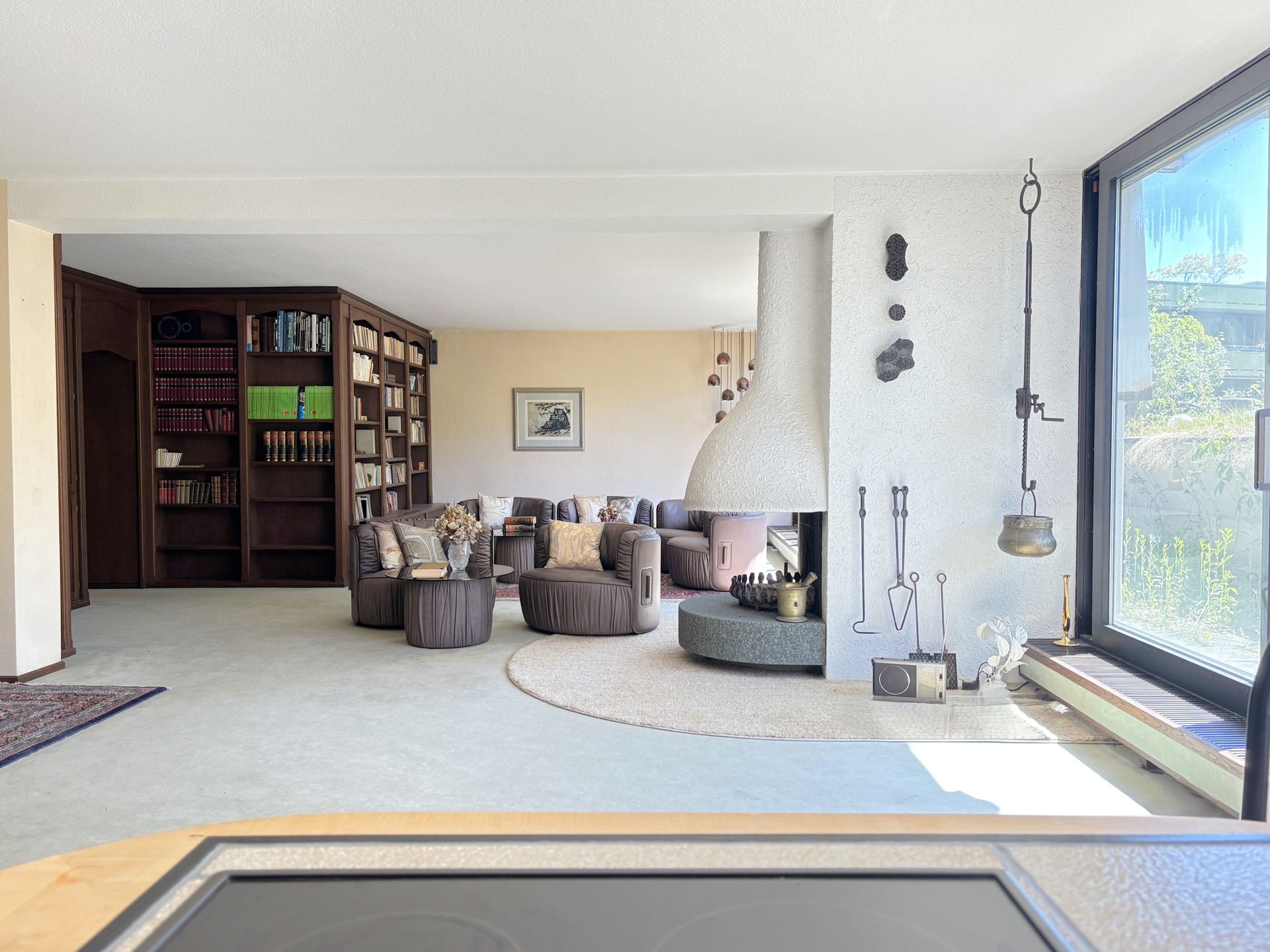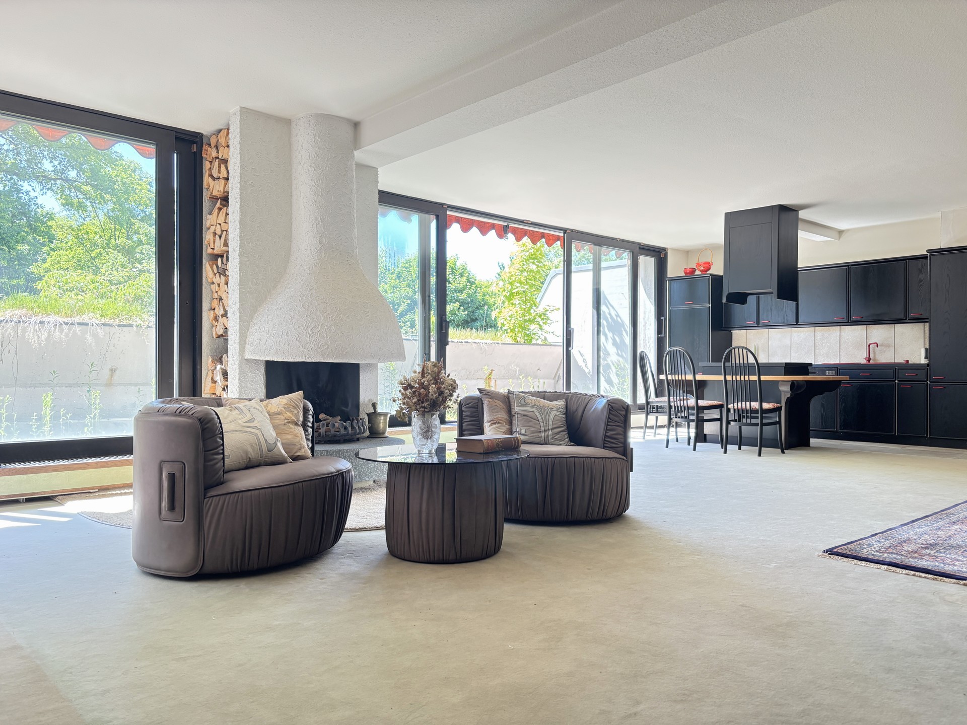 Wohnung. Eine große Fensterfront in Südausrichtung sorgt für viel Tageslicht und eine angenehme Atmosphäre. Ein maßgefertigter Einbauschrank vom Schreiner und ein Kamin schaffen zusammen mit