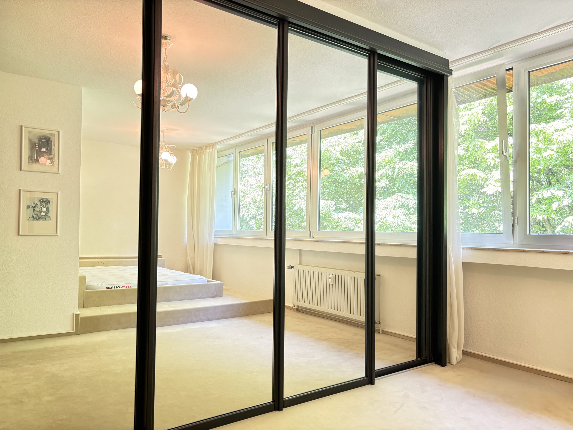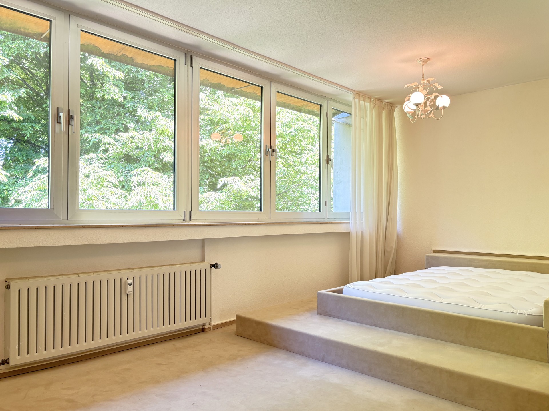 die grünen Baumkronen ermöglicht. Ein maßgefertigtes Einbaubett mit integrierter Ablage fügt sich passgenau in die vorhandene Nische ein und nutzt den Raum effizient aus. Sowohl das Bett als auch der Boden sind mit einem beigefarbenen Teppich ausgelegt, was dem Raum ein stimmiges und gemütliches Gesamtbild verleiht.