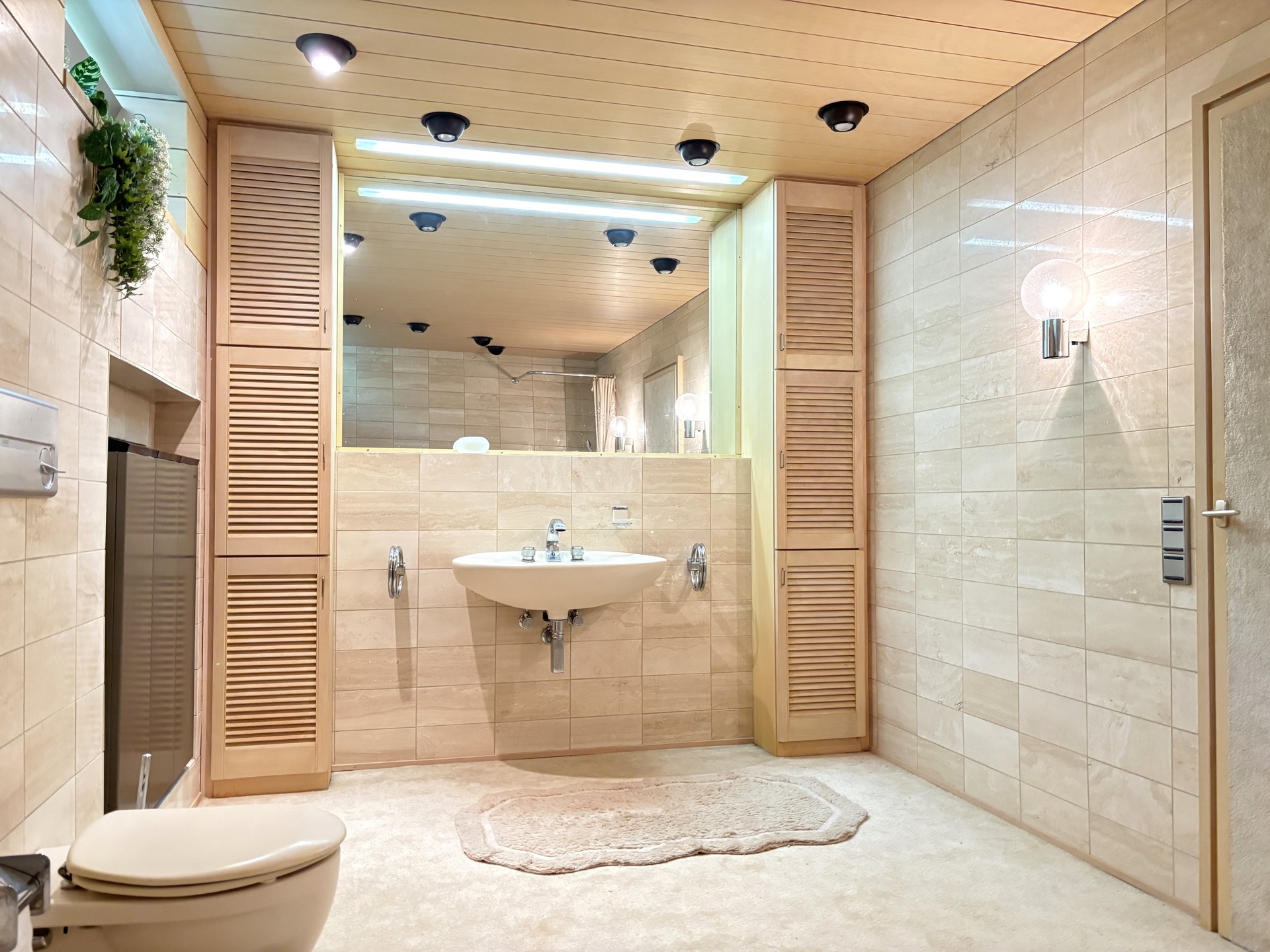 Das große Badezimmer überzeugt mit einem harmonischen Beige-Ton und einer Vielzahl hochwertiger Details. Eine besonders geräumige Eckbadewanne, eine separate Dusche, WC, Bidet und ein Waschbecken bieten höchsten Komfort. Zwei integrierte Einbauschränke fügen sich perfekt in das Gesamtbild ein und bieten praktischen Stauraum. Zwei Fenster oberhalb des Raumes sorgen für Tageslicht und frische Luft. Spotlights in der Decke und eine Beleuchtung im Spiegel schaffen zudem angenehme Lichtverhältnisse.